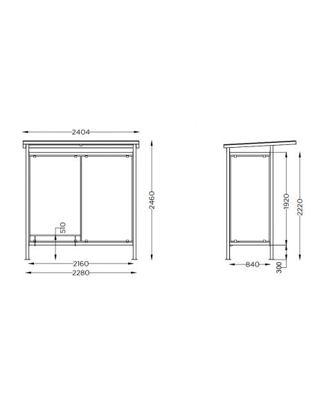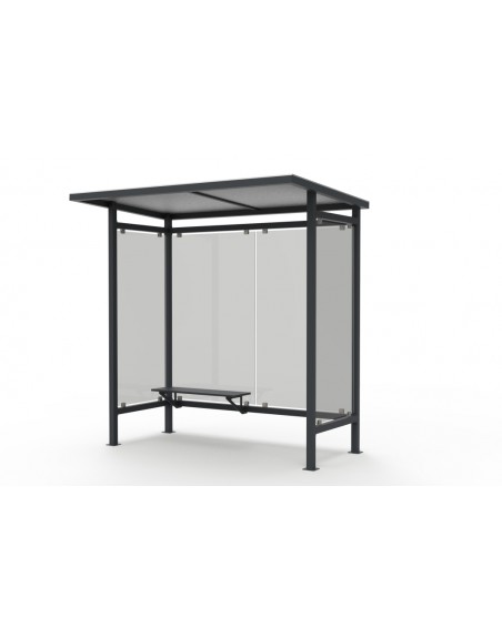 Konstrukcija pagaminta iš 2 mm storio kvadratinio 60 x 60 mm cinkuoto ir milteliniu būdu dažyto plieno. Stogas - 8 mm storio alveolinis polikarbonatas, sienos - 8 mm storio grūdintas stiklas. Integruotas suoliukas (matmenys: 1040 x 300 x 450 mm), kurio konstrukcija pagaminta iš 20 x 20 mm vamzdžio ir 2 mm storio perfruotos plieno plokštės.