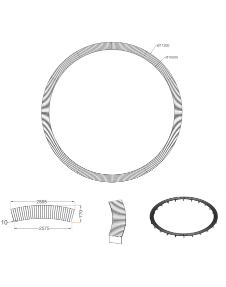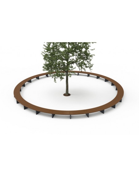 KOnstrukcija pagaminta iš 4 mm storio aliuminio lakšto, dažyto milteliniu būdu. Apdaila - tamsi alyvuota Kambala mediena. Sudarytas iš pusapvalės formos modulių.