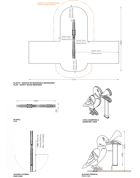 Konstrukcija pagaminta iš cinkuoto ir milteliniu būdu dažyto 200 x 100 mm plieno, apdailos elementai - 15 mm storio HDPE plokštė, grandinės - 5 mm nerūdijančio plieno.